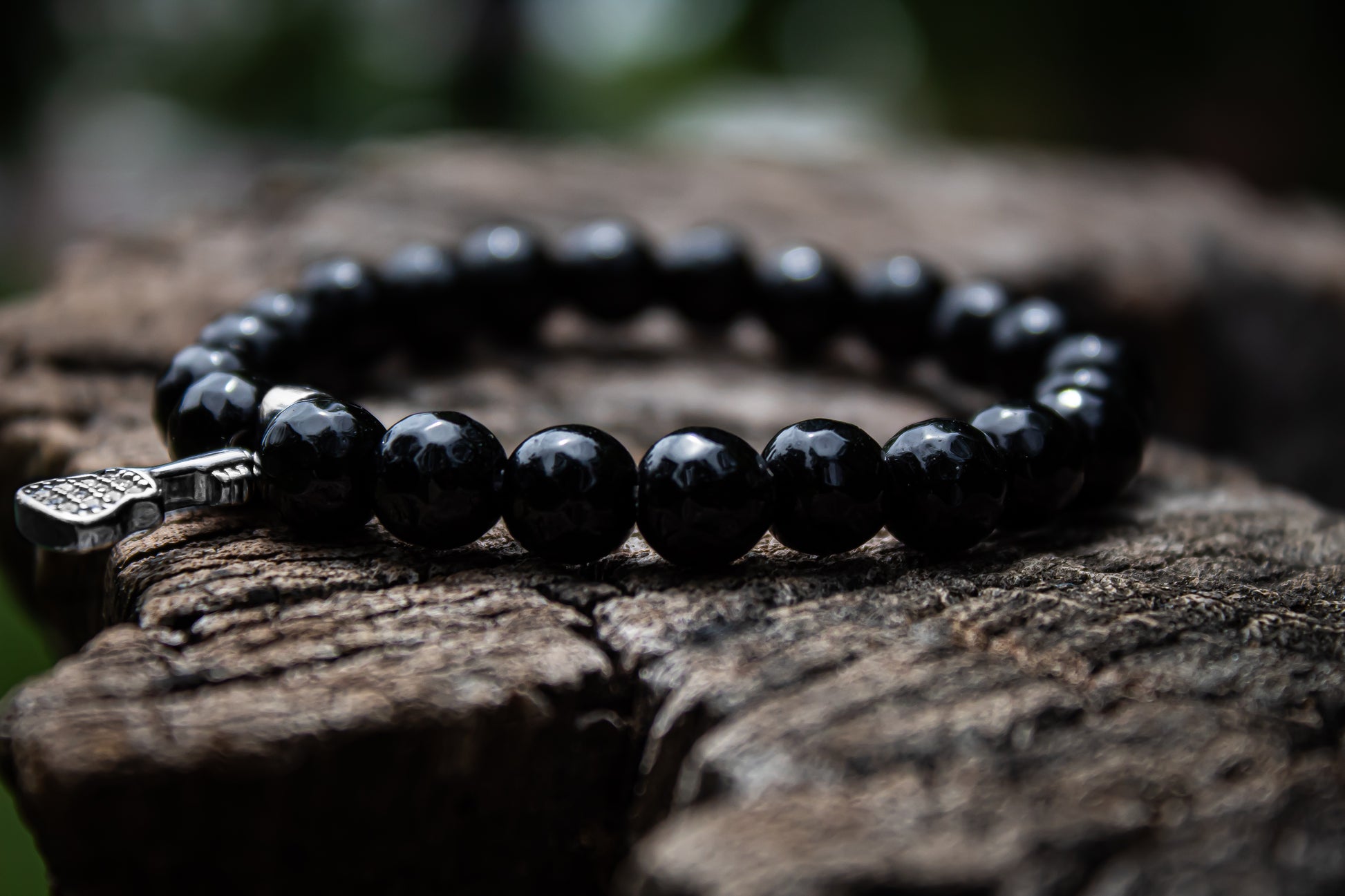 Black Beads Bracelet With 925 Sterling Silver Guitar Charm